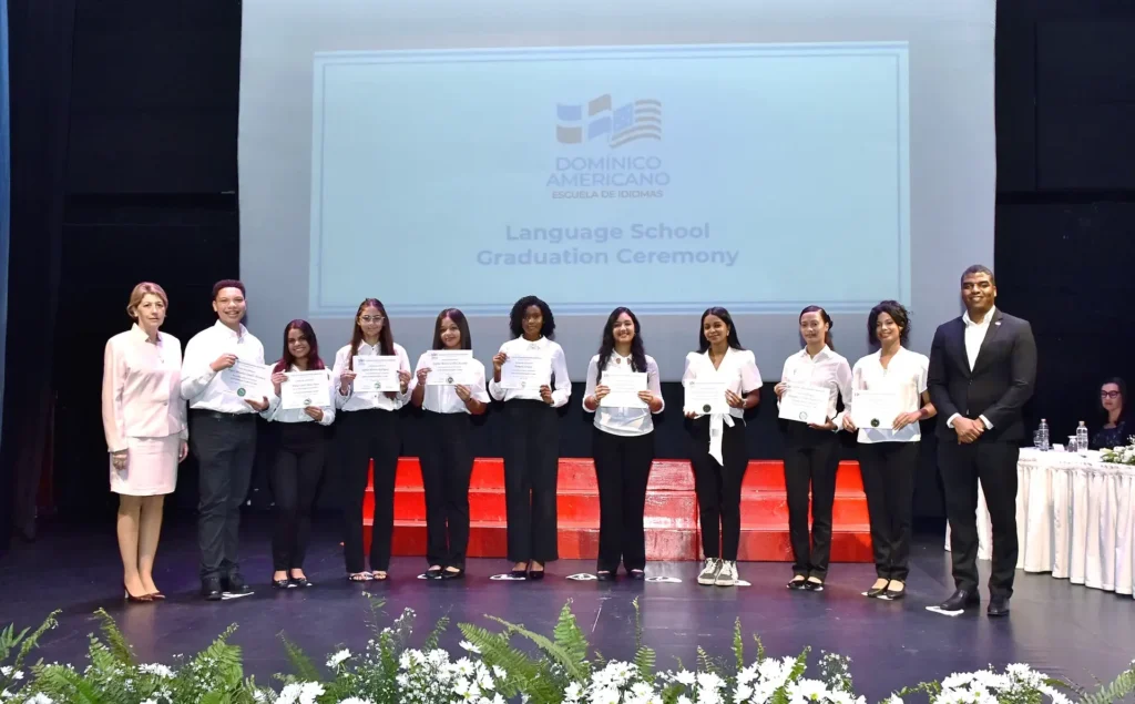 The ceremony concluded with remarks from the Director of the Language School, Robert Valcin, who emphasized the importance of continuing personal and professional growth. The musical presentation was performed by the Domínico Americano Mixed Choir.